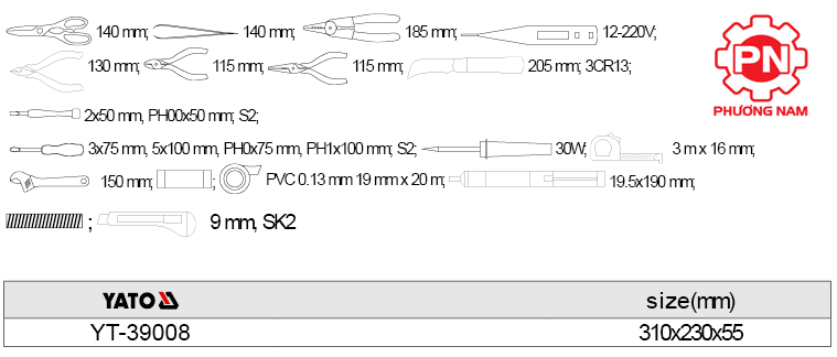Bộ dụng cụ sửa chữa tổng hợp 22 chi tiết Yato YT-39008 được Phương Nam cung cấp với giá thành tốt nhất, chất lượng chính hãng 100%, với đội ngũ nhân viên tư vấn nhiệt tình, dịch vụ hỗ trợ, chăm sóc khách hàng tận tâm, bảo hành chu đáo.