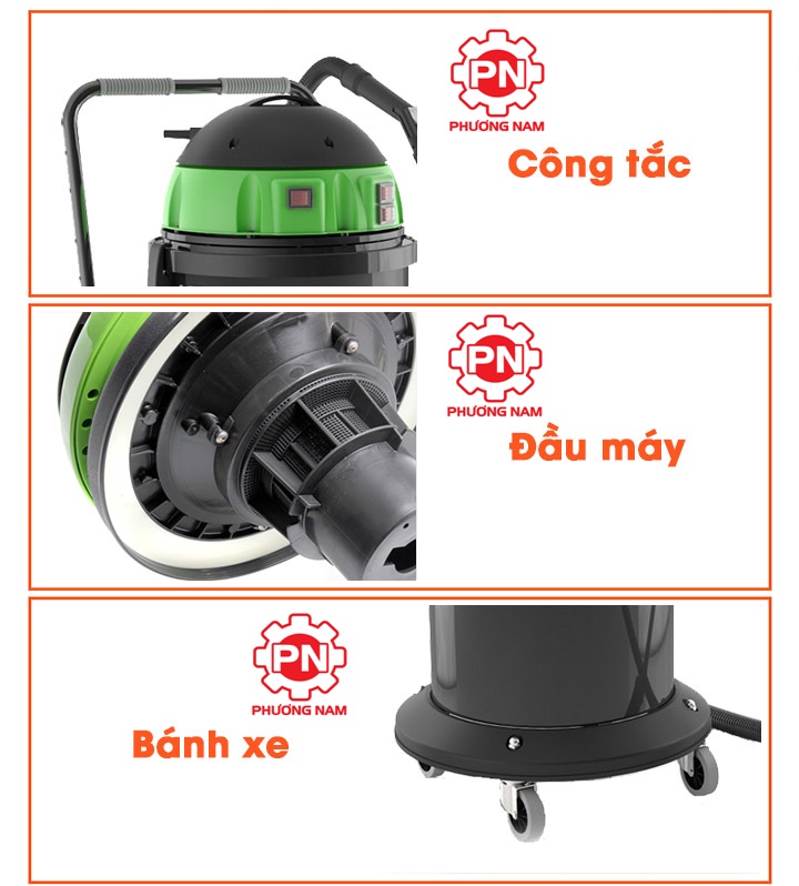 Ưu điểm đầu tiên của chiếc máy hút bụi công nghiệp khô ướt IPC model YP3/62 thu hút người dùng đó chính là thiết kế vô cùng ấn tượng với gam màu đen – xanh chủ đạo; tạo nên vẻ chắc chắn và khỏe khoắn. Bên cạnh đó, thiết bị này còn được thiết kế thêm phần tay đẩy phía sau gắn với thùng chứa, cùng hệ thống bánh xe dưới thân máy; điều này giúp việc di chuyển máy được nhanh chóng và thuận tiện hơn.