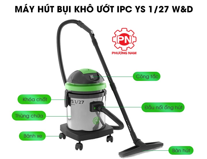 Máy hút bụi khô ướt IPC YS1/27 W&D được trang bị đồng thời hai tính năng hiện đại, dùng để làm sạch bụi khô và hút nước, chất lỏng nhanh chóng với công suất hoạt động từ 1250 – 1500W. Thiết kế của máy tối giản với thùng chứa có dung tích 20 lít, rất thích hợp để sử dụng ở những không gian có diện tích vừa và nhỏ như trường học, bệnh viện, siêu thị,…