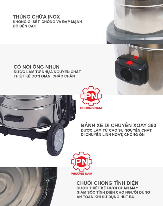 - Chức năng: hút khô/ hút nước và các bụi bẩn công nghiệp.