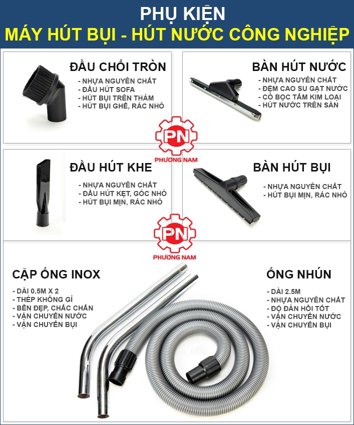 - Phụ tùng: 1 bàn hút nước/bụi, 02 ống Inox, 1 ống hút, 1 đầu hút góc, 1 đầu chổi tròn
