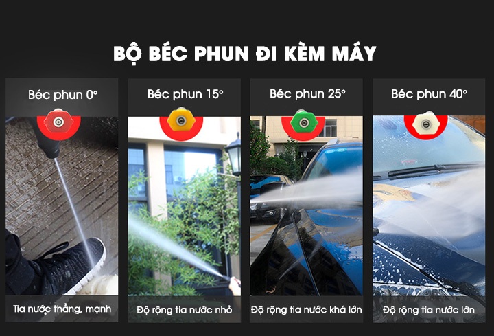 Đặc biệt, máy bơm rửa xe Lutian 20M32-5.5KW còn được trang bị một súng phun với 4 béc phun cơ bản: 0° (màu đỏ), 25° (màu vàng), 40° (màu trắng) và tia phun hóa chất (màu đen); nhằm đáp ứng mọi yêu cầu làm sạch và mang tới đạt kết quả cao nhất. Theo đó, đầu phun càng nhỏ/ hẹp sẽ cho áp lực càng lớn; tùy vào nhu cầu công việc cụ thể mà bạn lựa chọn tia phun sao cho phù hợp.