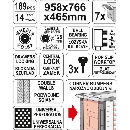 Thiết kế với 3 ngăn tủ to 4 ngăn nhỏ có thể cất giữ tất cả những dụng cụ cần thiết. Đặc biệt, các ngăn tủ có thêm các bảng ghi chú phân loại dụng cụ để dễ dàng hơn cho việc lưu trữ cũng như tìm kiếm.